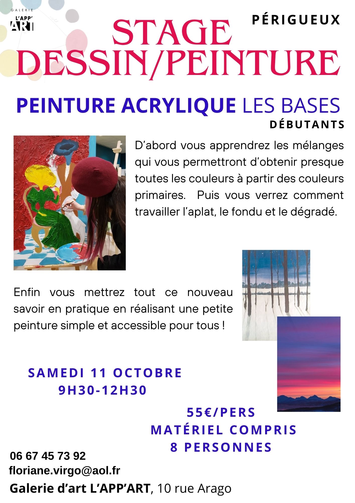 Stage dessin-peinture « Peinture acrylique » Pour débutant 9h30 à 12h30 3h – 55€ (matériel compris) 8 personnes