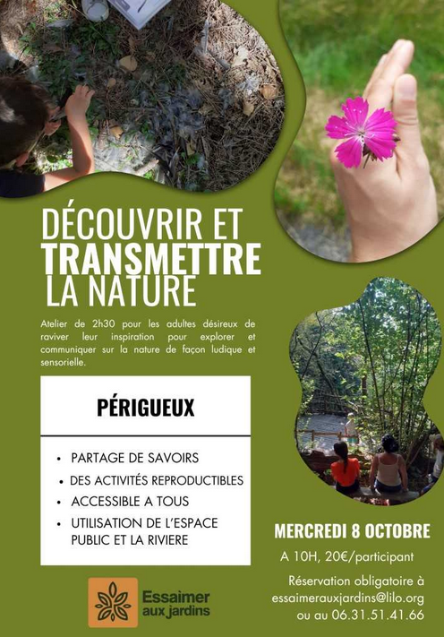 Atelier de 2h30 pour les adultes désireux de raviver leur inspiration pour explorer et communiquer sur la nature de façon ludique et sensorielle. Réservation obligatoire sur essaimerauxjardins@lilo.org ou au 06.31.51.41.66