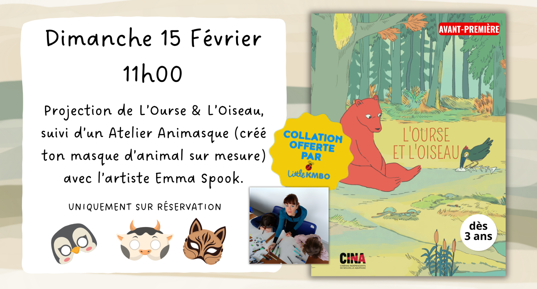 Atelier Animasque et Goûter avec L’Ourse et l’Oiseau À 11H00 : Découvrez « L’Ours et l’Oiseau » (dès 3 ans), une séance tout en douceur et en poésie, spécialement pensée pour le jeune public. À l’issue de la projection, les enfants pourront participer à un atelier créatif « Animasque » : Crée…