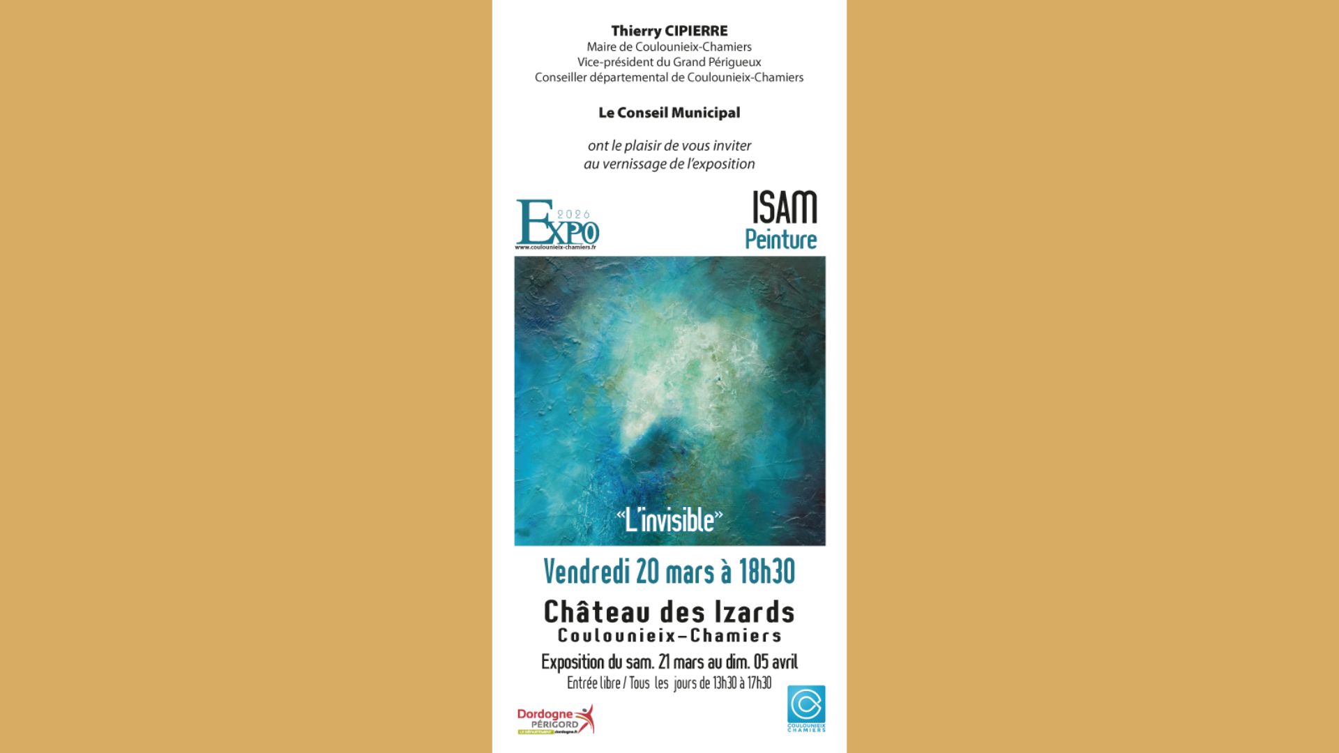 Le Château des Izards (Coulounieix-Chamiers) accueille une exposition de l’artiste peintre ISAM intitulée « L’invisible ». Ses œuvres seront présentées du 21 mars au 05 avril, avec un RDV pour le vernissage vendredi 20 mars prochain à 18h30. Isam est une artiste peintre autodidacte installée à Périgueux. Diplômée en tant que Doreuse…