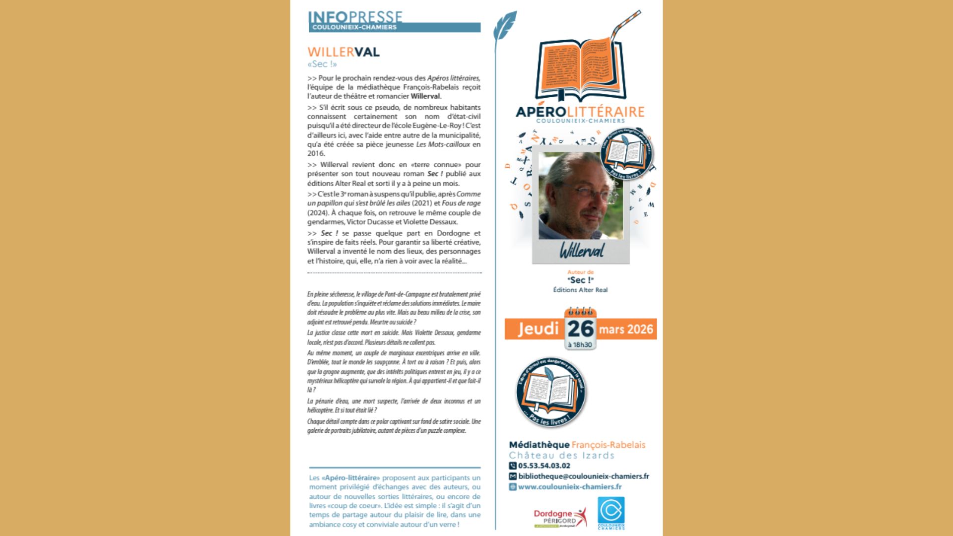 Pour le prochain rendez-vous des Apéros littéraires, l’équipe de la médiathèque François-Rabelais reçoit l’auteur de théâtre et romancier Willerval. S’il écrit sous ce pseudo, de nombreux habitants connaissent certainement son nom d’état-civil puisqu’il a été directeur de l’école Eugène-Le-Roy ! C’est d’ailleurs ici, avec l’aide entre autre de la municipalité,…