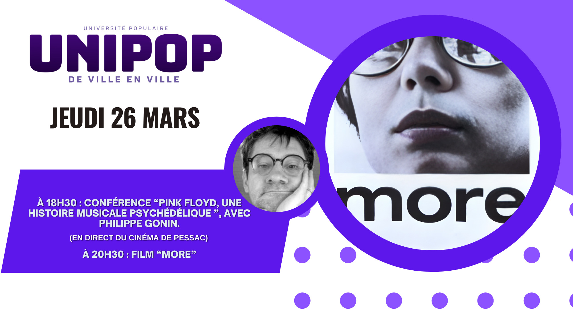 Unipop: Pink Floyd, une histoire musicale psychédélique Plongez dans l’univers fascinant et psychédélique de l’un des groupes les plus mythiques de l’histoire du rock. À 18H30 – Conférence Unipop (en direct du cinéma de Pessac) « Pink Floyd, une histoire musicale psychédélique » Le musicologue Philippe Gonin vous propose une…