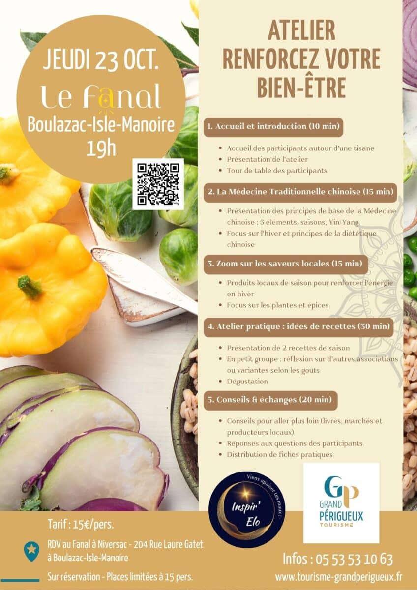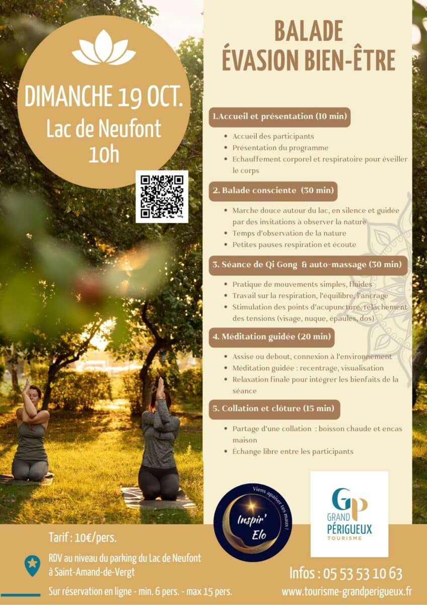 Découvrez nos ateliers bien-être en octobre ! Le 19 octobre, évadez-vous avec une balade évasion au Lac de Neufont : marche consciente, Qi Gong et méditation pour un moment de détente en pleine nature. Puis, le 23 octobre, renforcez votre bien-être au Fanal avec un atelier nutrition : médecine chinoise, recettes locales et conseils pratiques. Réservations obligatoires.