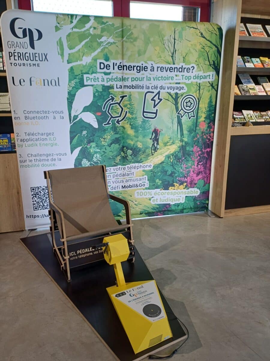La borne de recharge de téléphone 100% énergie humaine, by Ludik Energie, est à retrouver au Fanal ou en itinérance sur le Grand Périgueux.