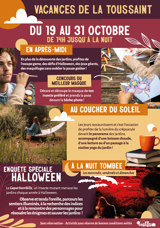 En après-midi, en plus de la découverte des jardins : escape game, défis d'Halloween, jeux géants, maquillages et pause goûter. Concours du meilleur masque : décore et découpe le masque de ton insecte préféré.